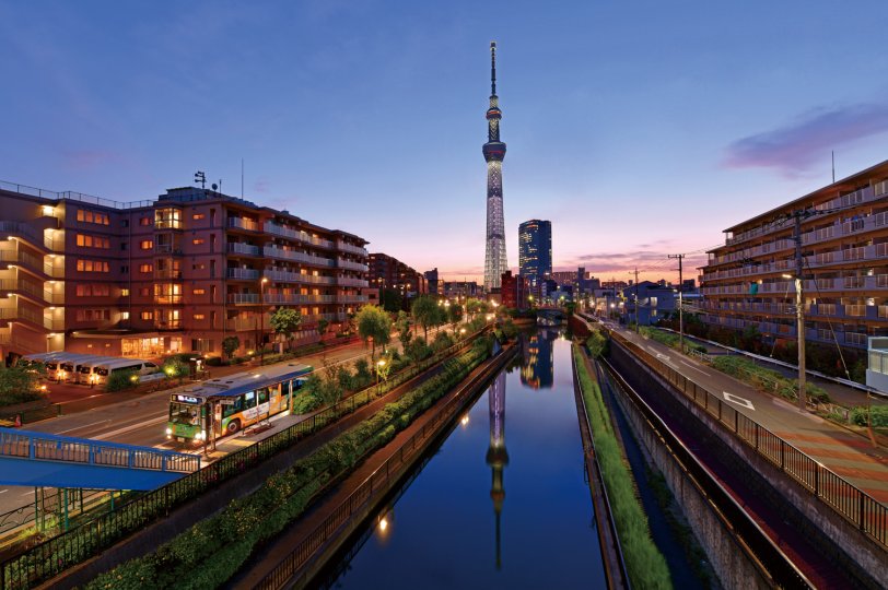 柳島歩道橋や福神橋などからは、川に映った美しい「逆さスカイツリー」を見ることができます。