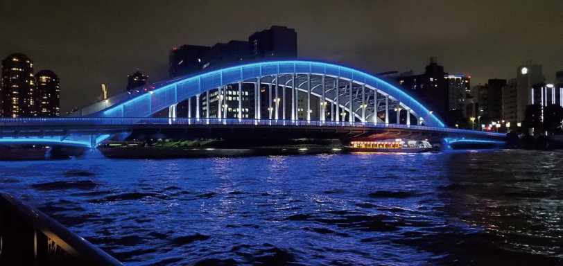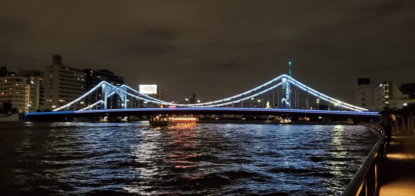 夜になると橋の光とビル群の明かりが隅田川に映って幻想的。