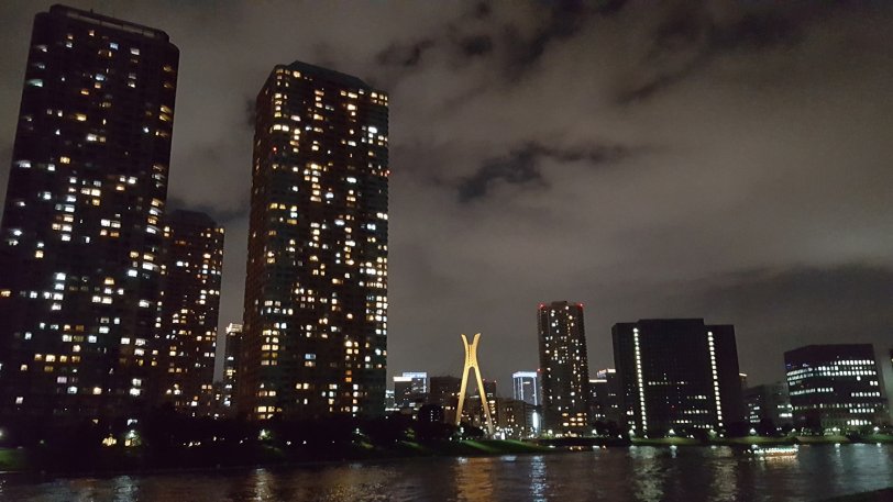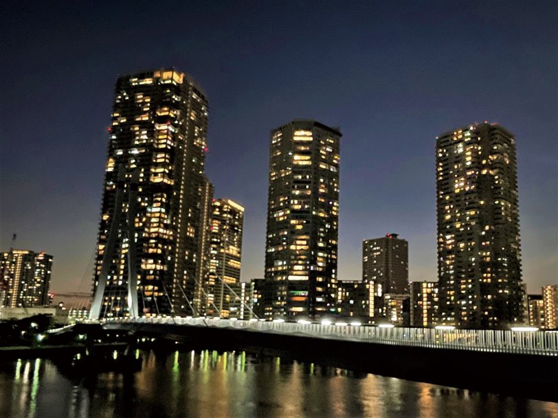眼前にそびえ立つ高層マンション群と、近代的なデザインの橋との迫力ある夜景は圧巻です。