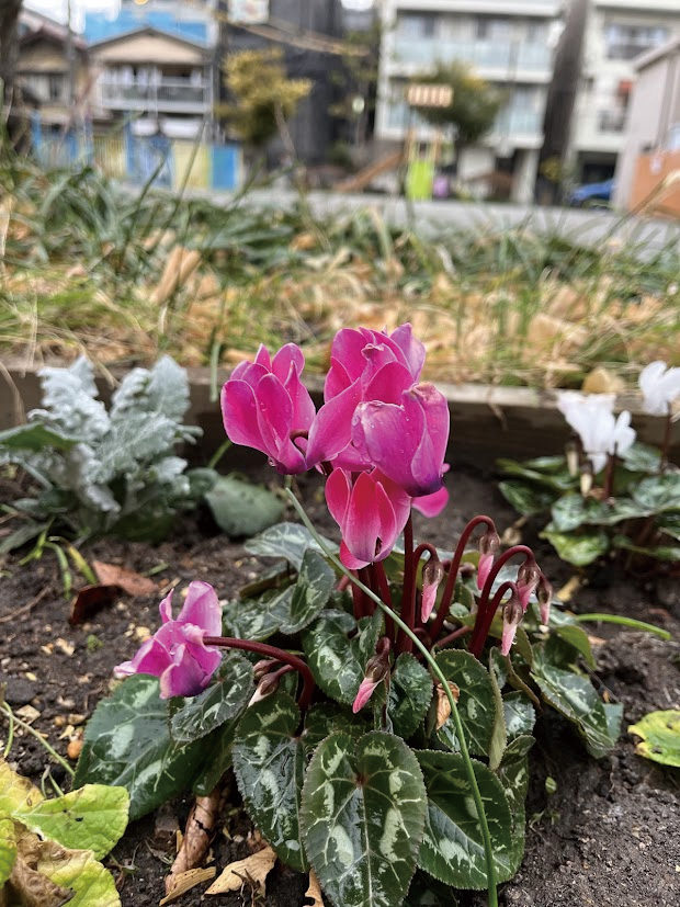 花が終わると種ができ、茎がくるくると巻く姿もユニークで、そこから「サイクル→シクラメン」と名がついたという説もあります。パンジーより早く店頭に並び、春遅くまで咲き続け、翌年も開花するというお得なお花です。